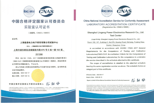 近日,上海臨港電力電子研究有限公司電力電子測(cè)試驗(yàn)證中心正式通過(guò)中國(guó)合格評(píng)定國(guó)家認(rèn)可委員會(huì)(CNAS)認(rèn)可,并獲得實(shí)驗(yàn)室認(rèn)可證書。